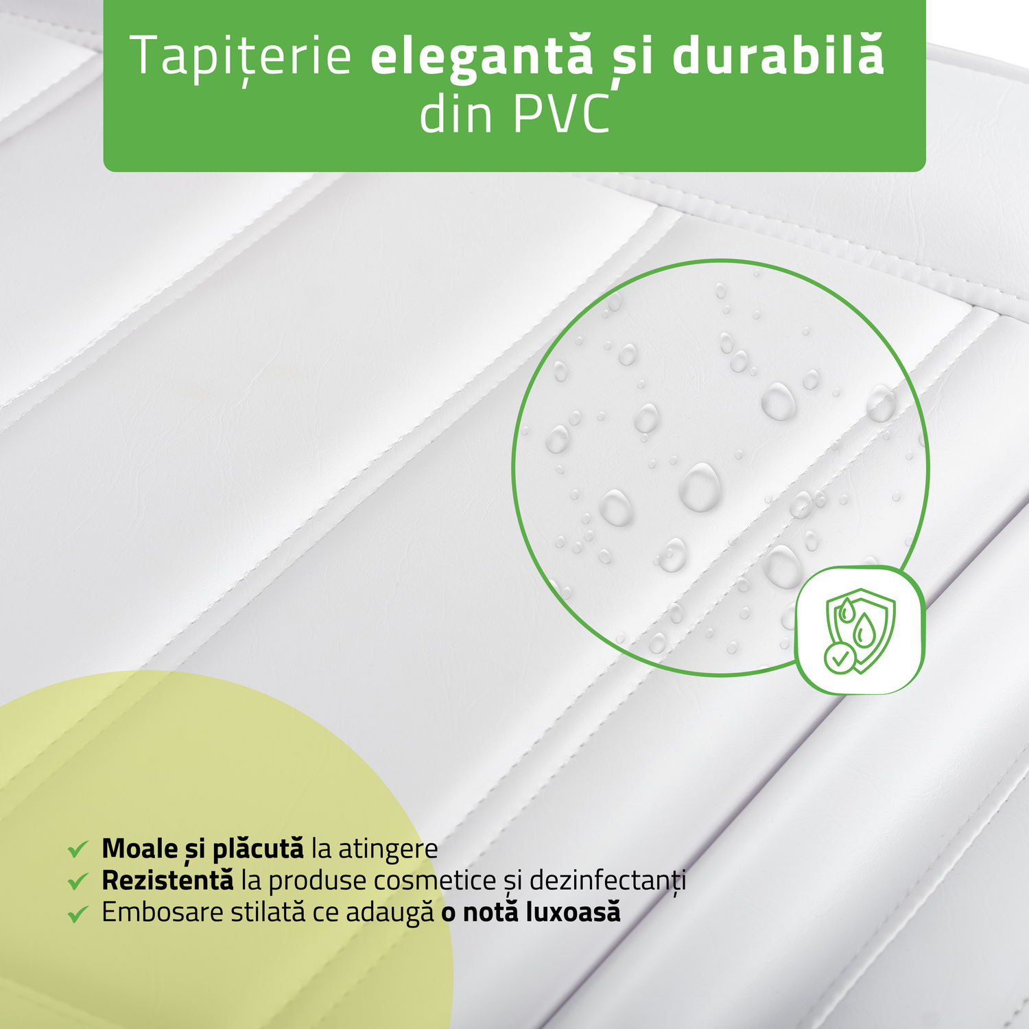 - Șezut ergonomic: spumă de înaltă densitate și formă anatomică pentru confort maxim, chiar și în timpul tratamentelor de durată.