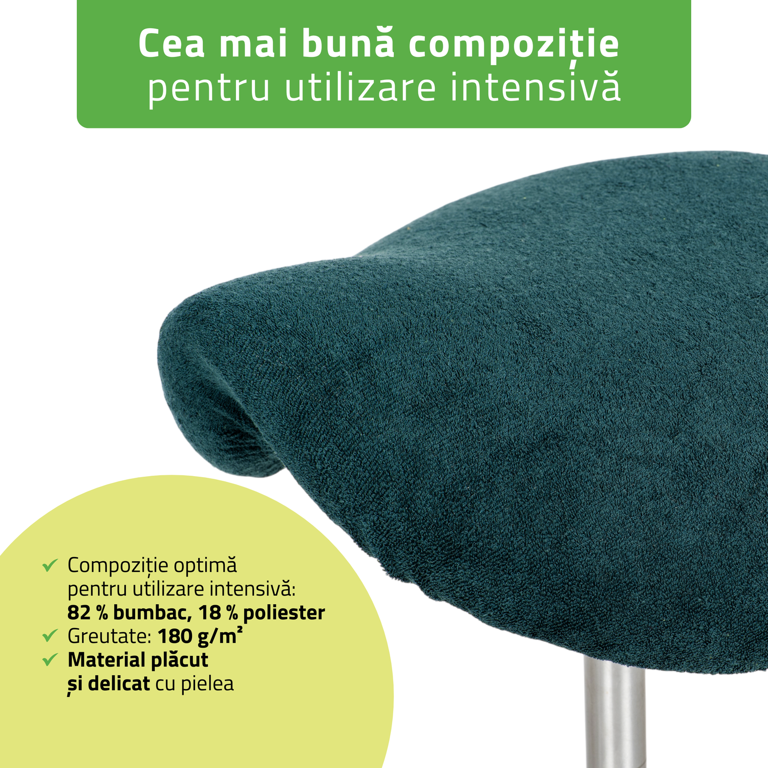 Compoziție optimă pentru utilizare intensă: 82% bumbac, 18% poliester: bumbacul natural asigură moliciune și absorbție, iar adaosul de poliester crește durabilitatea și elasticitatea.