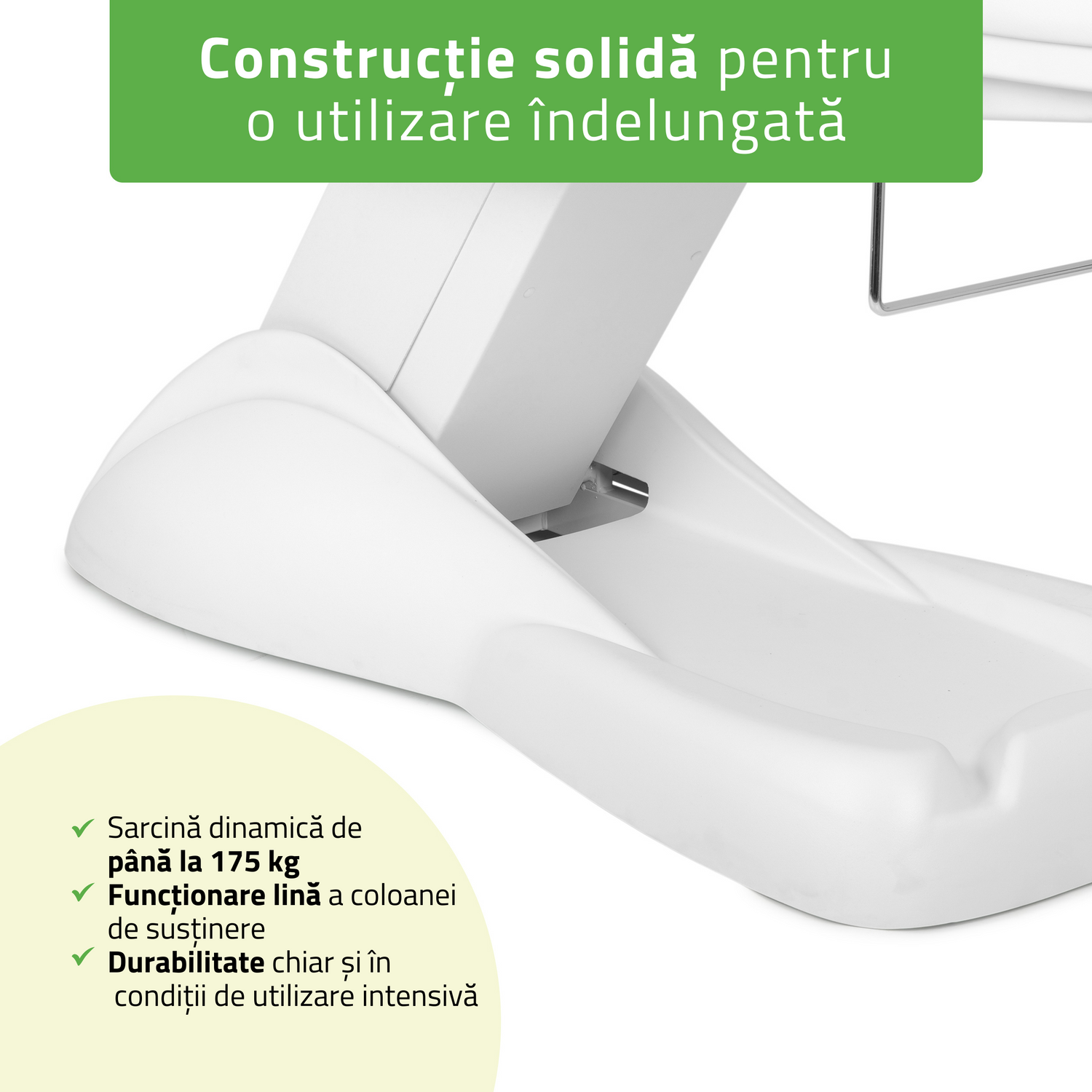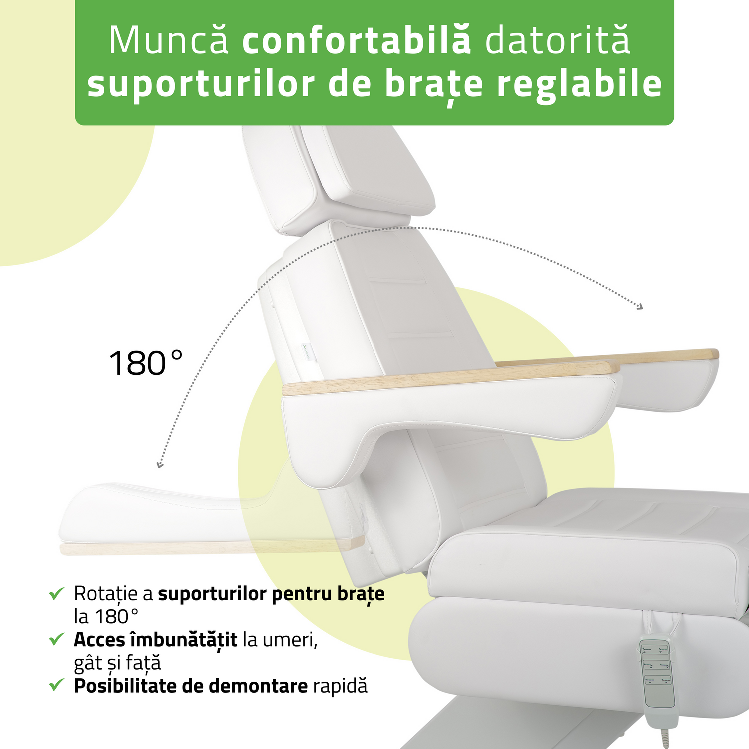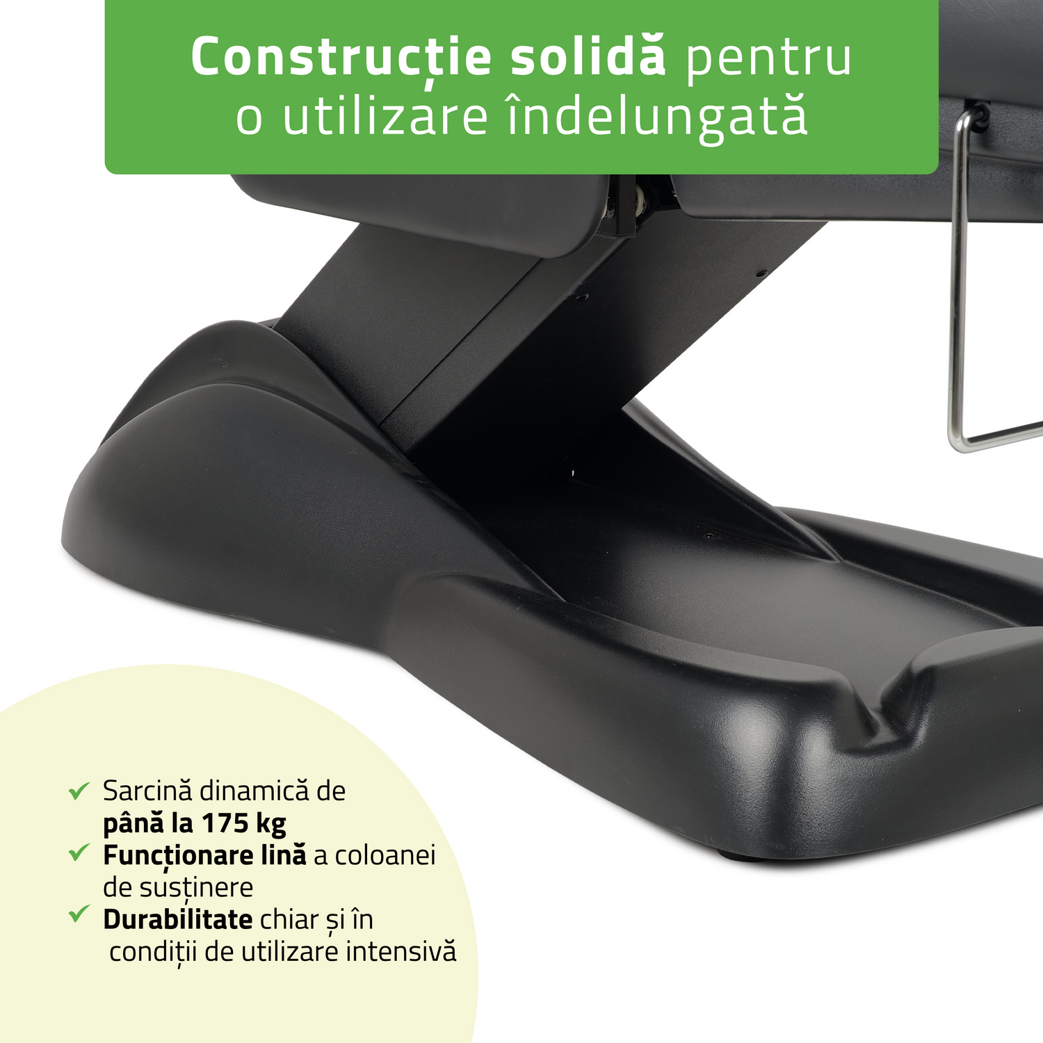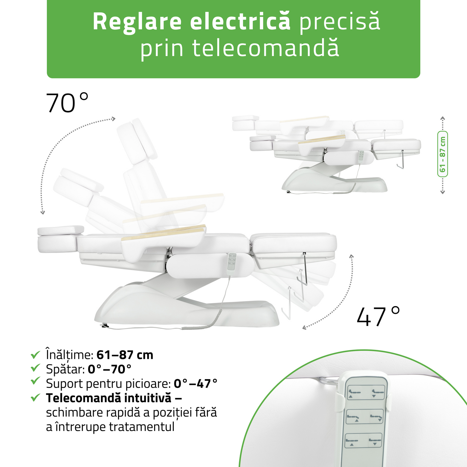 - Poziție culcat: ideală pentru masaje, tratamente cosmetice și terapii de relaxare.