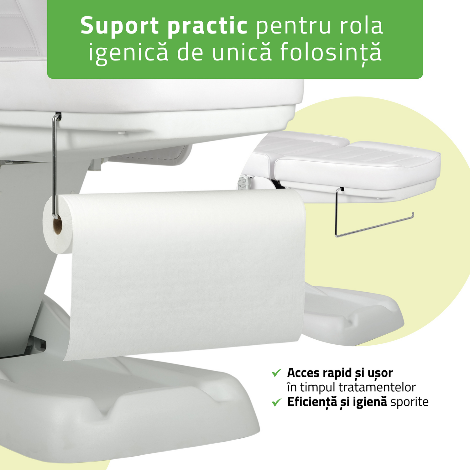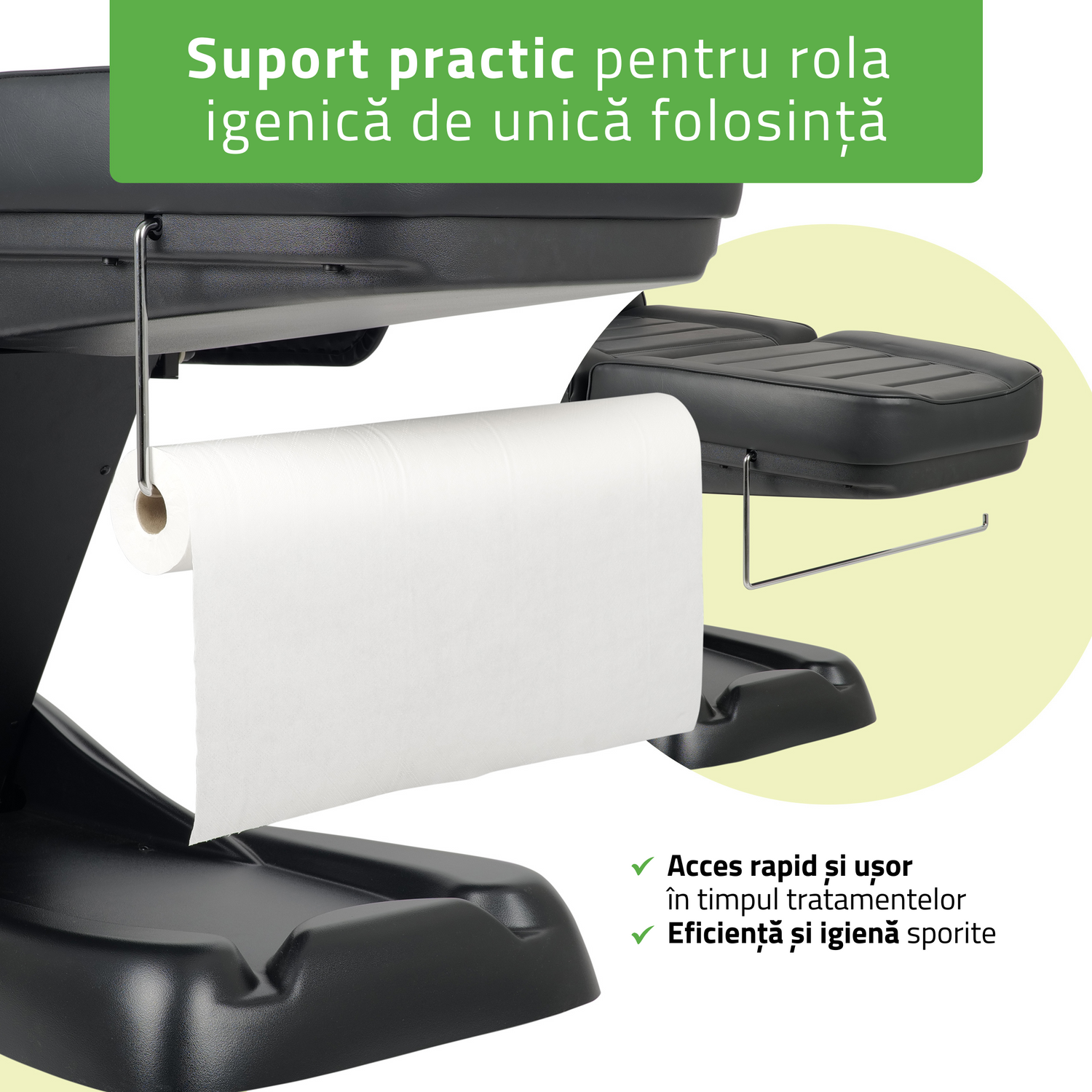 - Suport pentru rola de hârtie: dotat cu un suport practic pentru hârtie de unică folosință, ce crește eficiența și igiena în timpul tratamentelor.