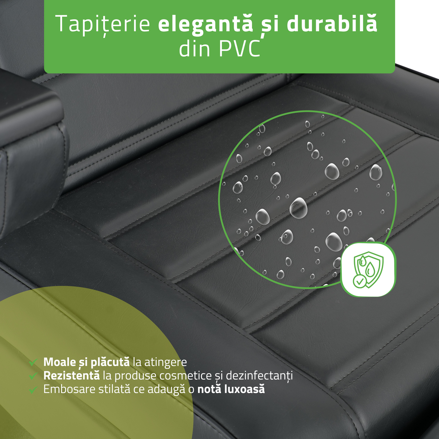 - Șezut ergonomic: spumă de înaltă densitate și formă anatomică pentru confort maxim, chiar și în timpul tratamentelor de durată.