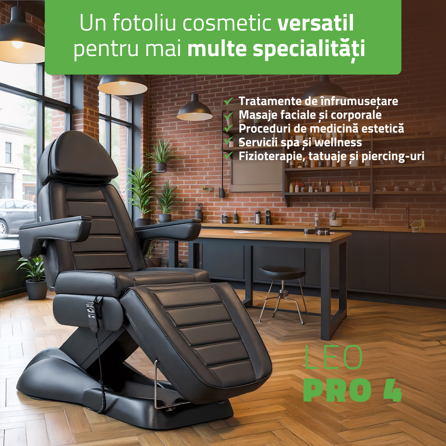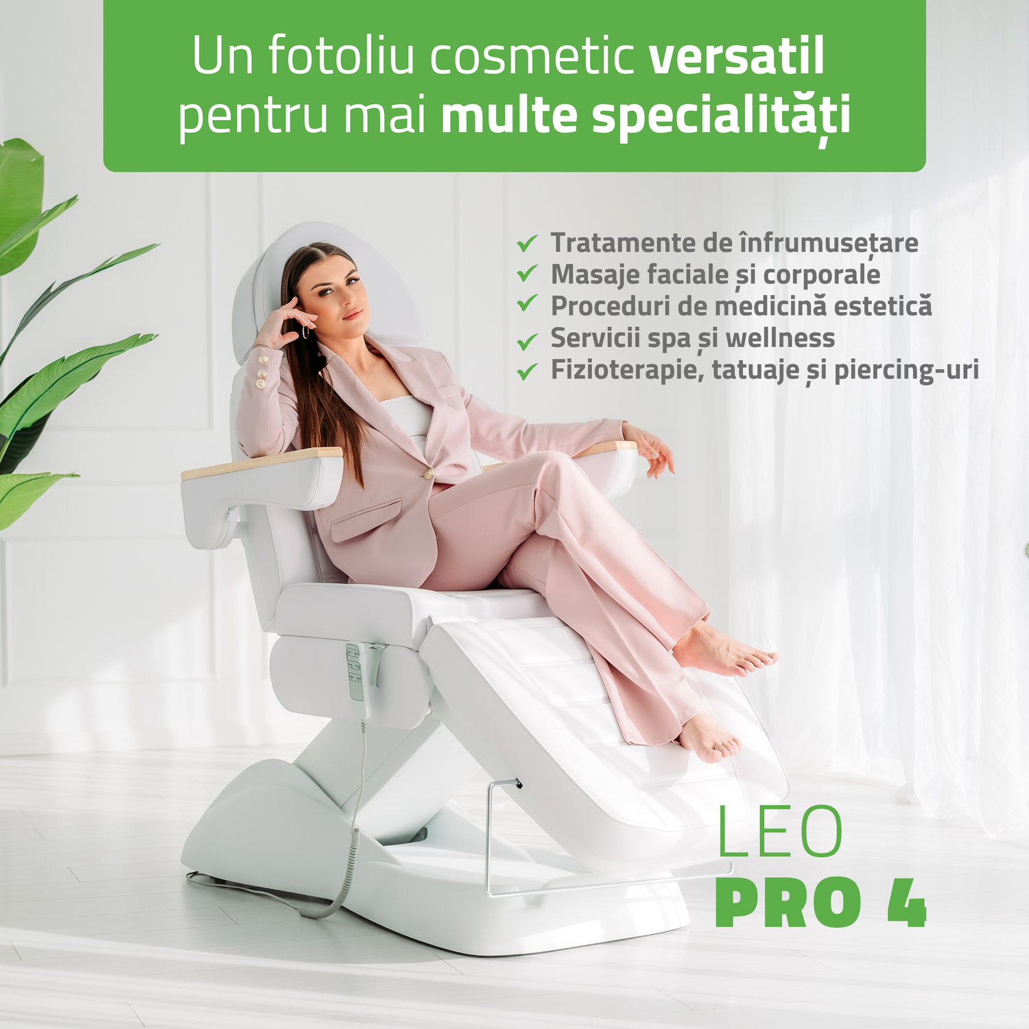 Fotoliul cosmetic electric Leo PRO 4 a fost conceput pentru a răspunde cerințelor profesioniștilor care caută soluții moderne și testate. Datorită reglajului electric precis, scaunul îmbunătățește semnificativ confortul și eficiența în timpul tratamentelor.