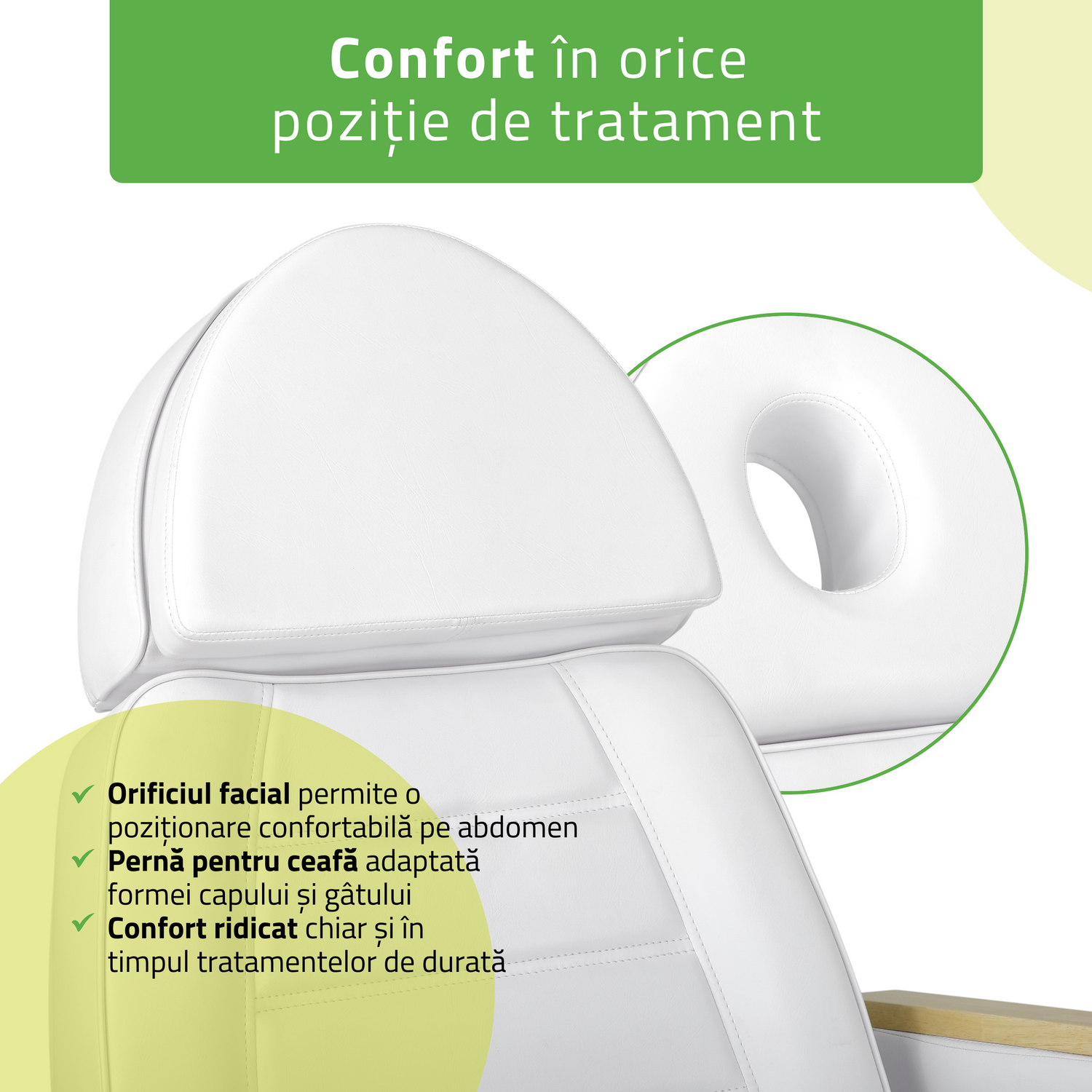 - Orificiu facial în tetieră: decupaj special conturat care permite poziționarea confortabilă cu fața în jos.