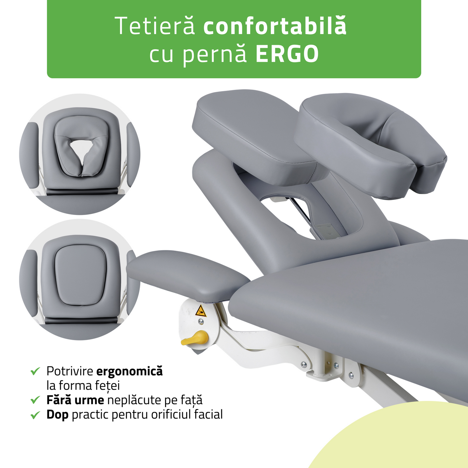 • Tetieră reglabilă cu orificiu facial și pernă ERGO – oferă confort atât în poziție culcat pe spate, cât și pe burtă, în timpul terapiilor de durată. Reglajul cu piston pe gaz permite un unghi între -70° și +40°.